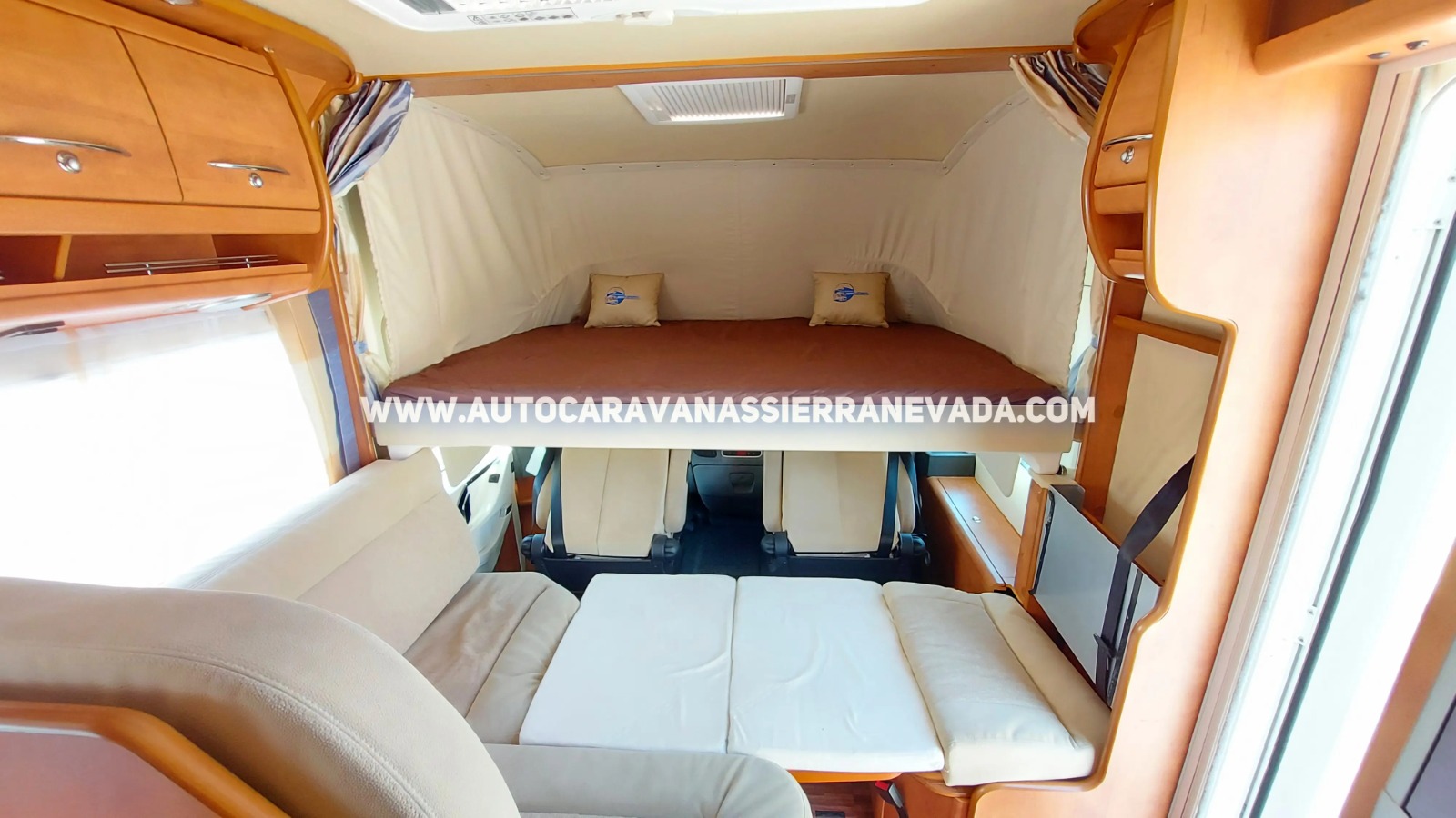 Asientos giratorios, Oscurecedores REMIS en cabina completa, Mosquiteras en ventanas, claraboyas y puerta principal, Claraboyas transparentes y Claraboya xxl en salón, Frigo DOMETIC (220v, Gas, 12v, Auto) 150L capacidad, Horno