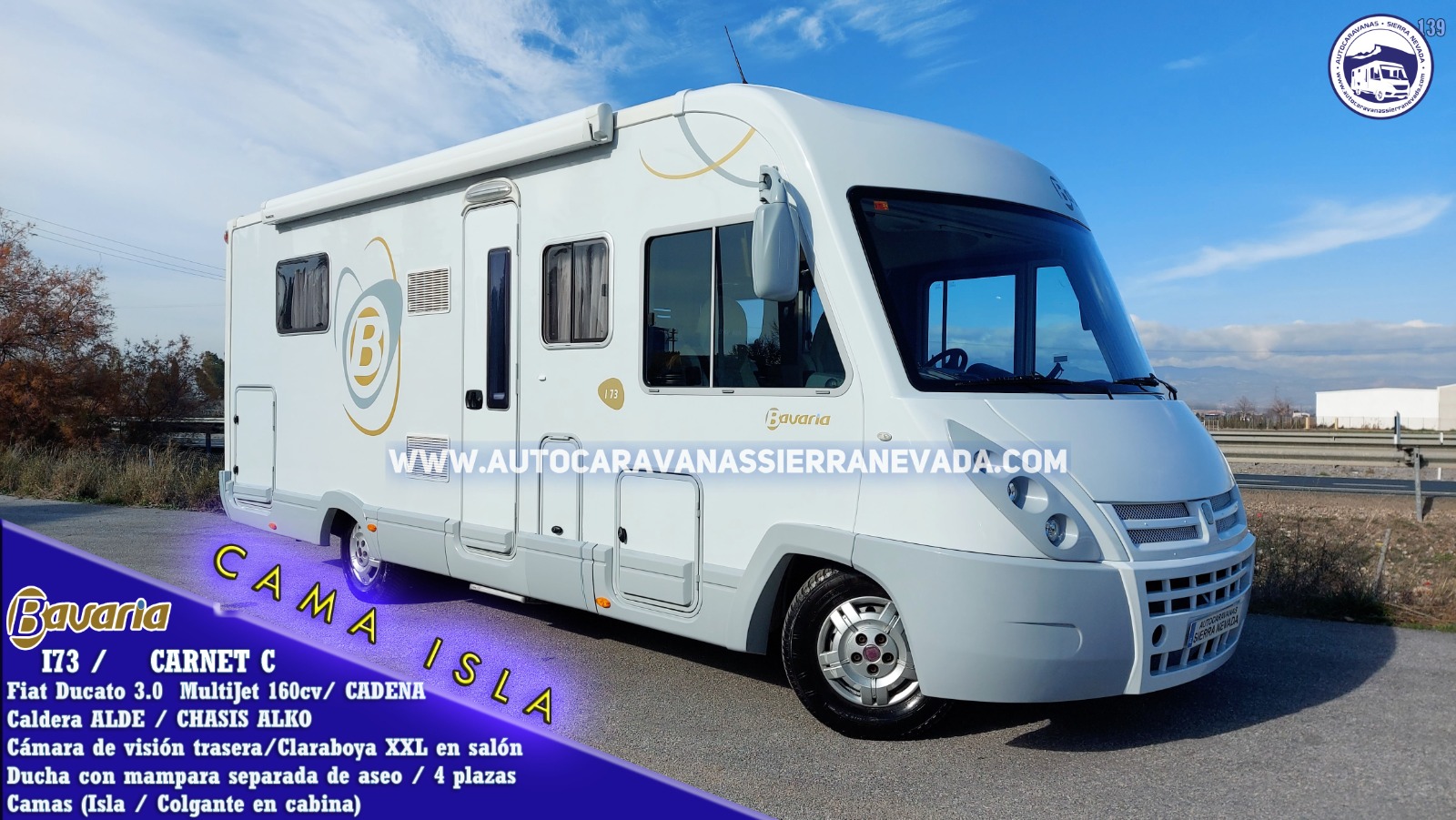 Autocaravana Integral de la marca, BAVARIA, modelo i73. Esta marca está situada en el mercado entre una de las mejores de Europa. Tiene una línea muy actual, ambiente acogedor, con unos acabados y muebles de alta calidad. Año 2009 y con tan solo 98.000km y toda su documentación que los certifican. Motor Fiat Ducato 3.0 MultiJet 160cv con CADENA de distribución y 6velocidades, muy duro, potente y de fácil mantenimiento. Chasis ALKO con doble suelo y Suspensión con barras de torsión (mucho mejor que la suspensión de ballestas) y con gran espacio de almacenamiento en el doble suelo. Se conduce con carnet C, su M.M.A 4.000kg la mayor ventaja en su capacidad de carga. La calefacción y el agua caliente funcionan mediante la caldera ALDE, insonora y de radiadores como en casa. Con 4 plazas homologadas para viajar y dormir gracias a su Cama colgante doble sobre cabina y cama isla detrás, uno de los modelos más selectos, ideal para parejas. La facilidad y comodidad a la hora de hacerla y levantarse de ella, hace que sea el modelo de cama más demandado por nuestros clientes. Dispone de bodega XXL con doble portón, sus medidas son: (2,25m x 1,00m x 1,00m) Esta increíble autocaravana mide: (7,30m x 3,10m) perfecta para hacer largos viajes o vivir en ella.