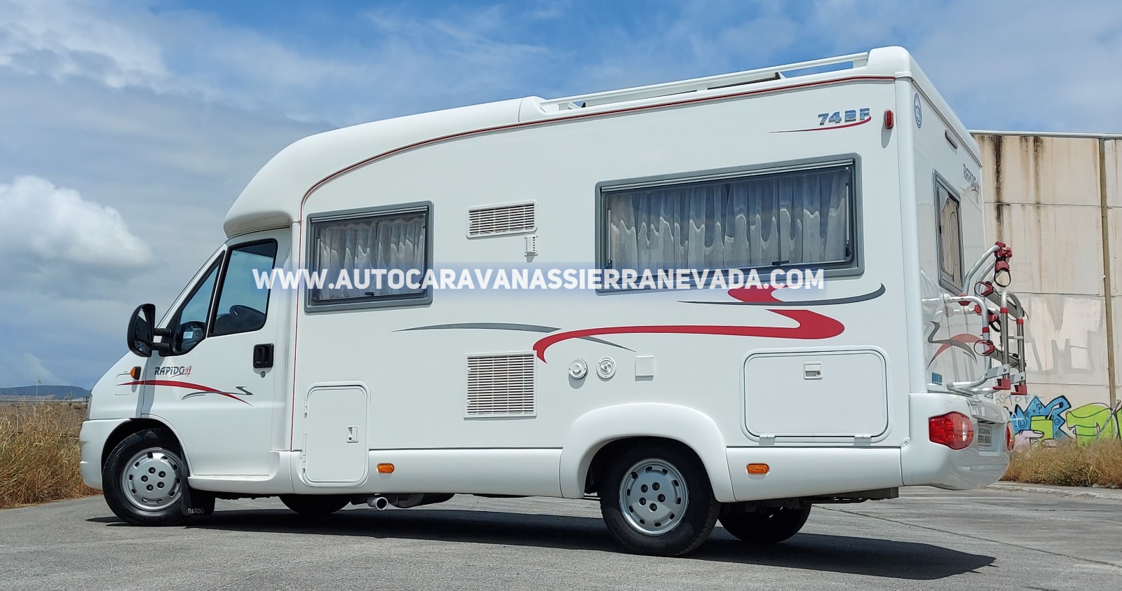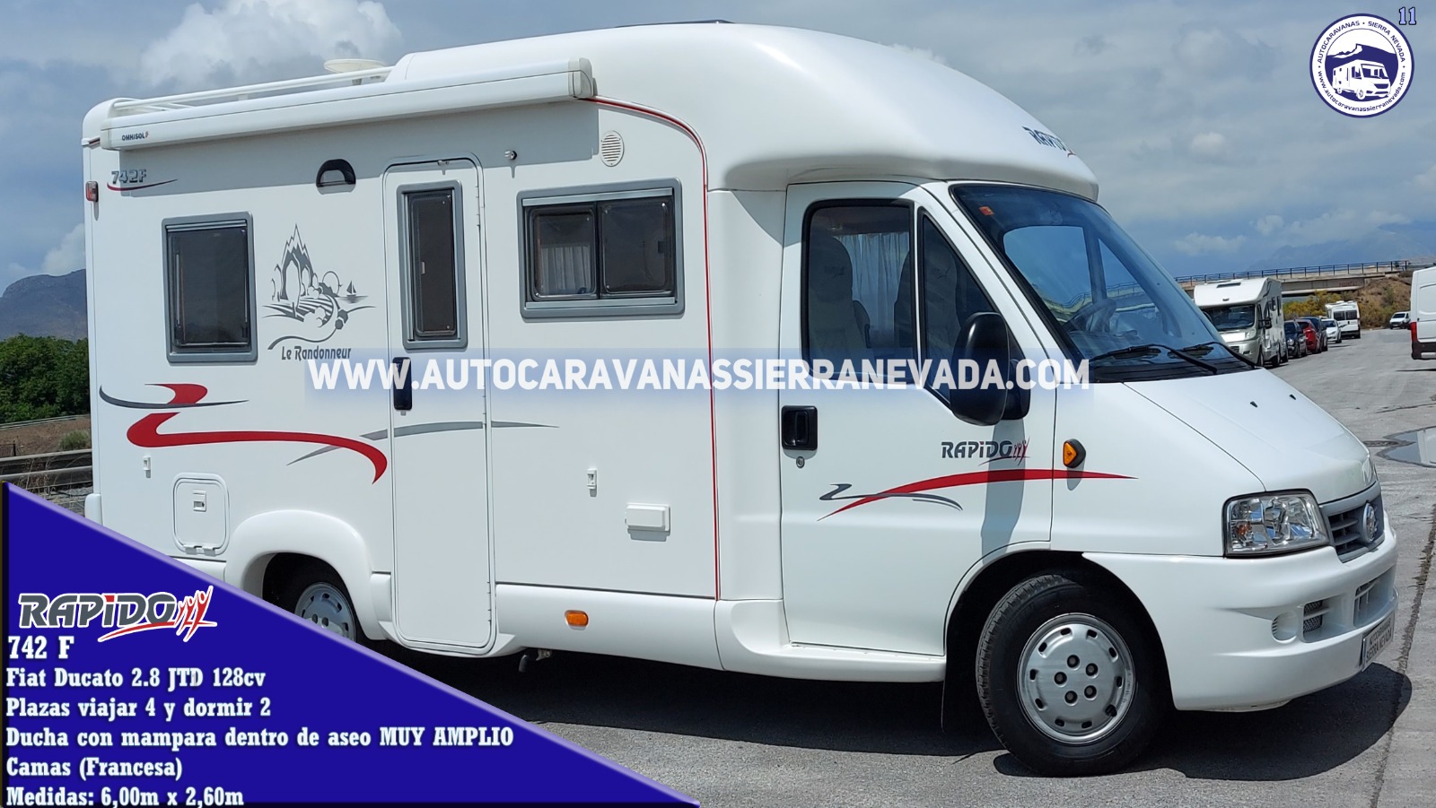 Autocaravana Perfilada RAPIDO, modelo 742F, una de las marcas más valoradas del mercado por su gran calidad y terminaciones estando a la altura de Hymer, Niesmann, Eura mobil entre otras. Con un gran motor, Fiat Ducato 2.8 JTD 128 cv, muy potente y de fácil mantenimiento. Año 2003, y con 73.000 km. Con 4 plazas para viajar y 2 para dormir, gracias a su cama Francesa en la parte trasera. A petición del nuevo comprador se puede hacer una pequeña modificación en el salón para dormir una persona más. Ideal para gente que quiere una autocaravana muy cómoda de llevar y entrar en aparcamientos reducidos, se conduce igual que un turismo, con unas medidas (6,00 m x 2,60 m). Dispone de un amplio maletero y sus medidas son (1,35 m x 2,00 m x 0,60 m).