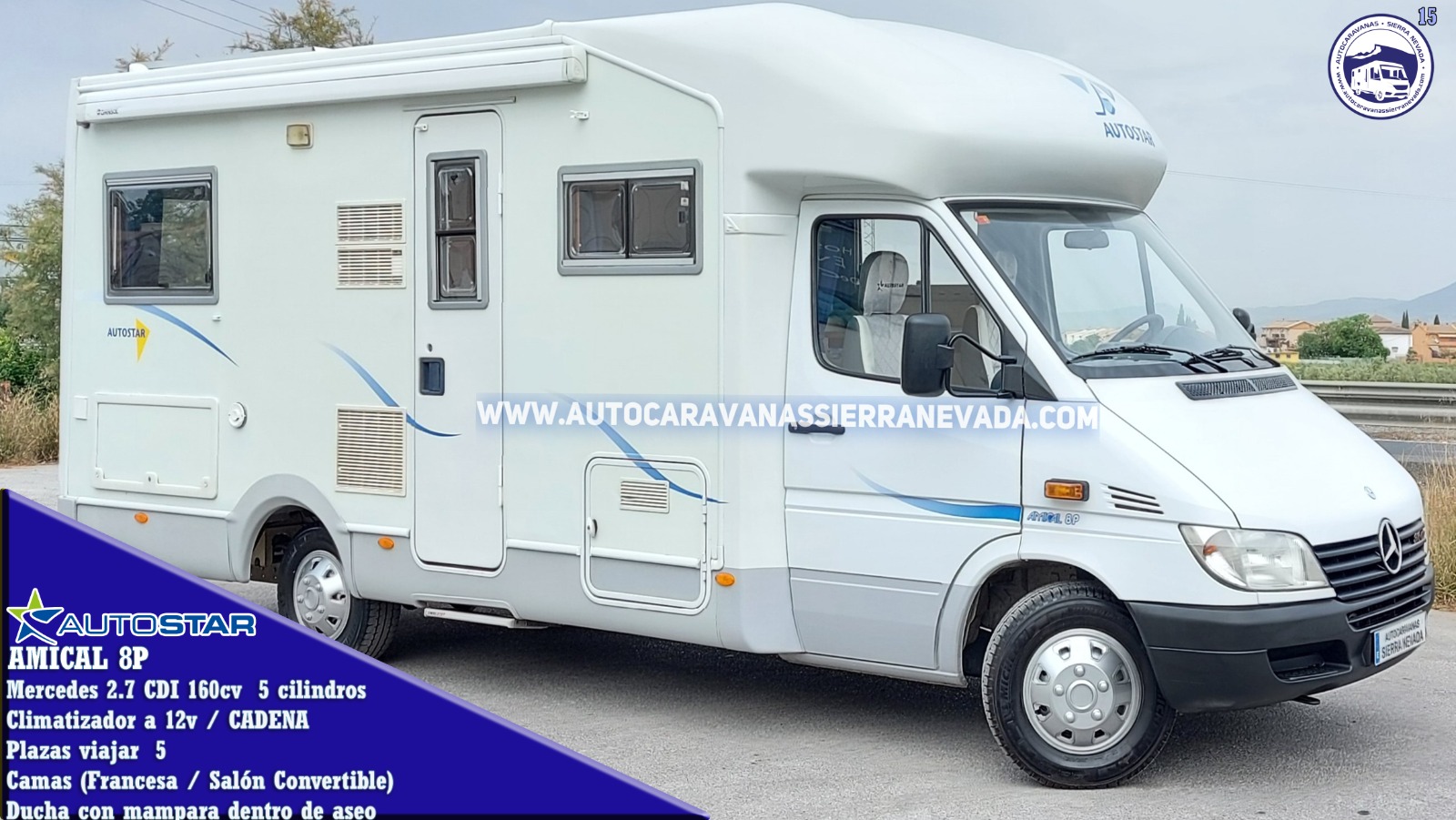 Autocaravana Perfilada AUTOSTAR, modelo AMICAL 8P, una de las marcas de más calidad de Francia y especialistas en la fabricación de modelado Perfilado. Con un Motor Mercedes 2.7 CDI 160 cv, 5 cilindros el motor más duro y potente y lo mejor de todo, con CADENA de distribución. Del año 2004 y con 71.000 km, un vehículo muy cuidado de un solo propietario. Homologada para viajar 5 personas. Dispone de dos camas dobles: Salón convertible doble y Francesa en la parte trasera abatible con acceso a su amplio garaje, con unas medidas: (1,30 m x 1,00 m x 0,50 m). Muy bien distribuido y amplia a pesar de no tener unas medidas excesivamente grandes, ideal para gente que quiere una autocaravana muy cómoda de llevar y entrar en aparcamientos reducidos, se conduce igual que un turismo, Medidas: (6,90 m x 2,70 m). Dispone de un climatizador a 12v en zona de cocina.